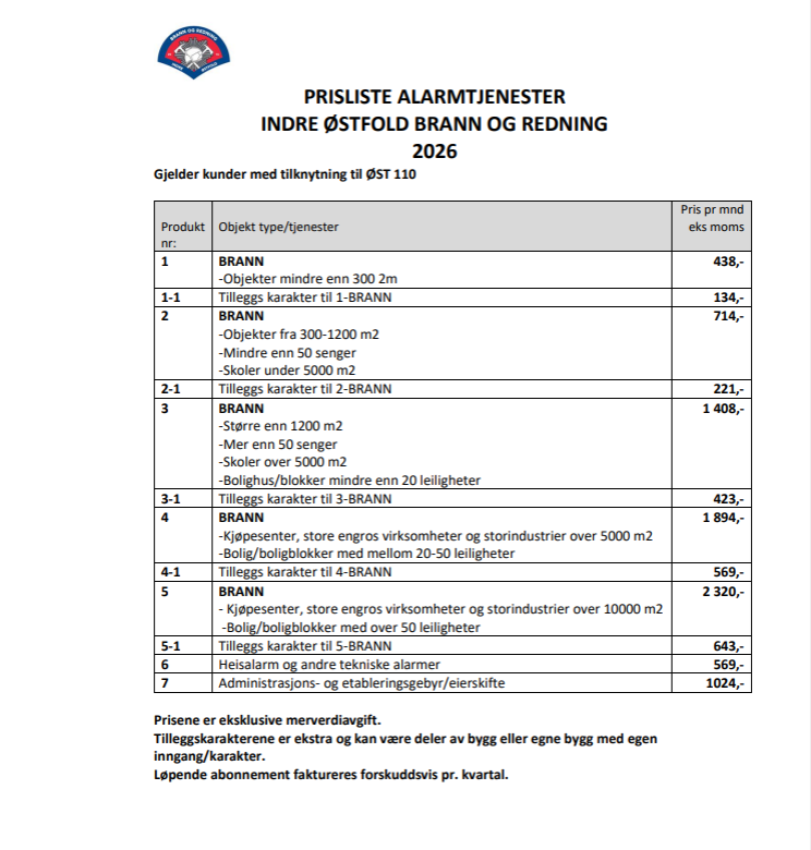 Prisliste alarmtjenester Prislisten gjelder for kunder tilknyttet ØST-110.Prisene er eksklusive merverdiavgift. Tilleggskarakterer er ekstra og kan omfatte deler av bygg eller separate bygg med egen inngang/karakter. Løpende abonnement faktureres forskuddsvis per kvartal.